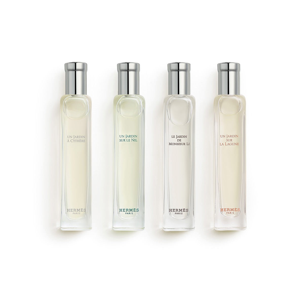 Hermès Jardin Miniature Set (4 x 15 ml) es un elegante conjunto de fragancias que captura la esencia de distintos jardines exóticos. Incluye cuatro Eau de Toilette de 15 ml cada una: